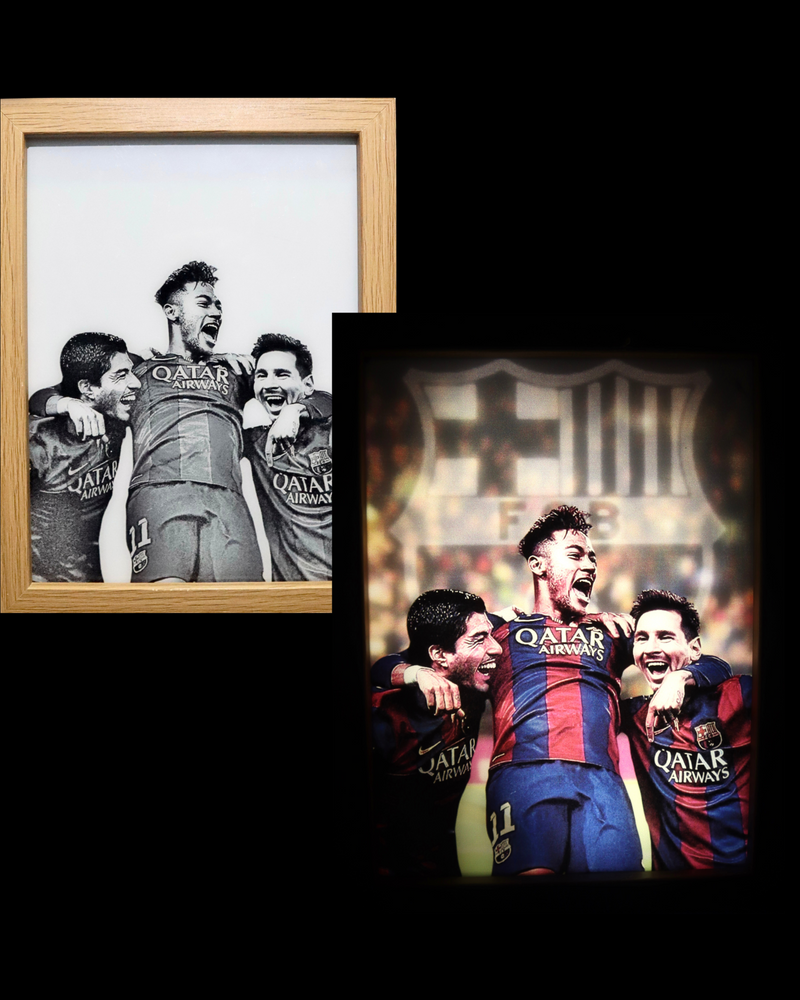 Our frames are built to protect your print — the front (black & white side) has a plastic cover, while the coloured back doesn’t, so handle it carefully to avoid scratches. Each frame comes in A4 or A5, includes built-in LED lighting, and lets you easily swap out designs whenever you want.